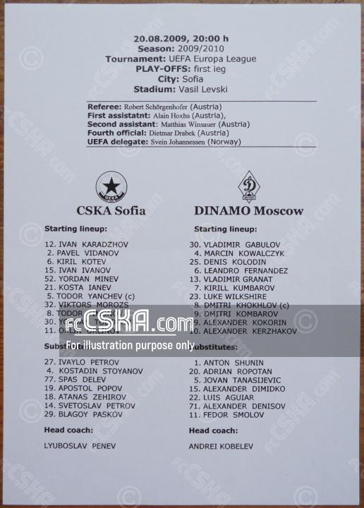 ЦСКА сыграла вничью с фк Динамо (Москва) со счётом 0:0 в матче сыгранный 20 Август 2009 г. в 20:00 ч. на стадионе „Васил Левски“ в София.