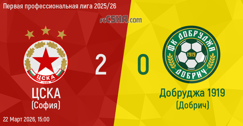 ЦСКА выиграл у Добруджа 1919 (Добрич) со счётом 2:0 в матче Первая профессиональная лига 2025/26 сыгранный 22 Март 2026 г. в 15:00 ч. на стадионе „Васил Левски“ в София. за армейцев отличились Макс Эбонг (46′) и Леандро Годой (69′ from penalty).