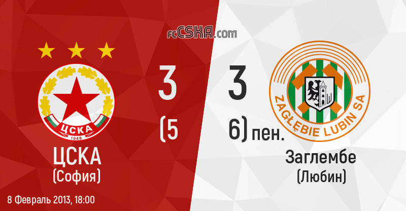 ЦСКА сыграла вничью с фк Заглембе (Любин) со счётом 3:3 в матче сыгранный 8 Февраль 2013 г. в 18:00 ч. за армейцев отличились Апостол Попов (32′), Ilias Kiriakidis (56′ и 120′ from penalty), Serzh Nyuandzhi (64′), Lukas Sasha (120′ from penalty), Ndzhongo Priso (120′ from penalty), Grigor Dolapchiev (120′ from penalty) и Ivaylo Chochev (120′ from penalty).