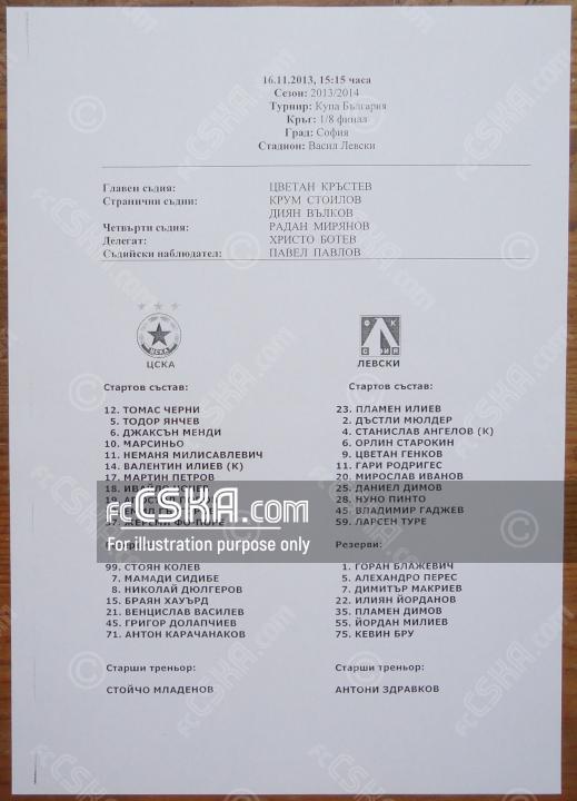 ЦСКА сыграла вничью с фк Левски (София) со счётом 0:0 в матче сыгранный 16 Ноябрь 2013 г. в 15:15 ч. на стадионе „Васил Левски“ в София.