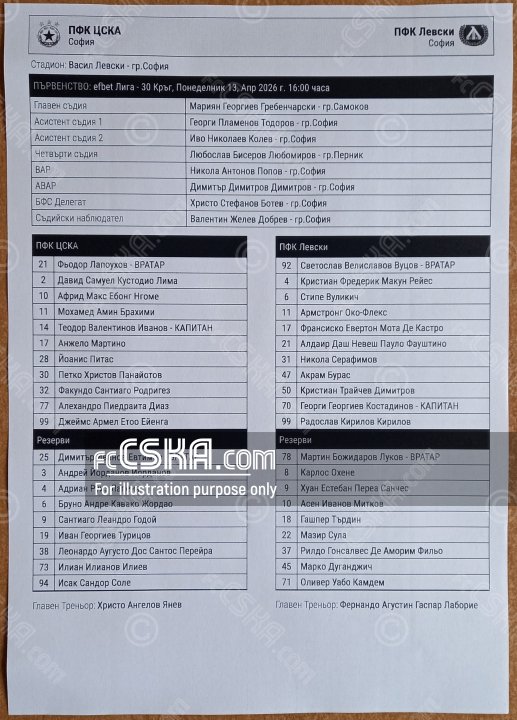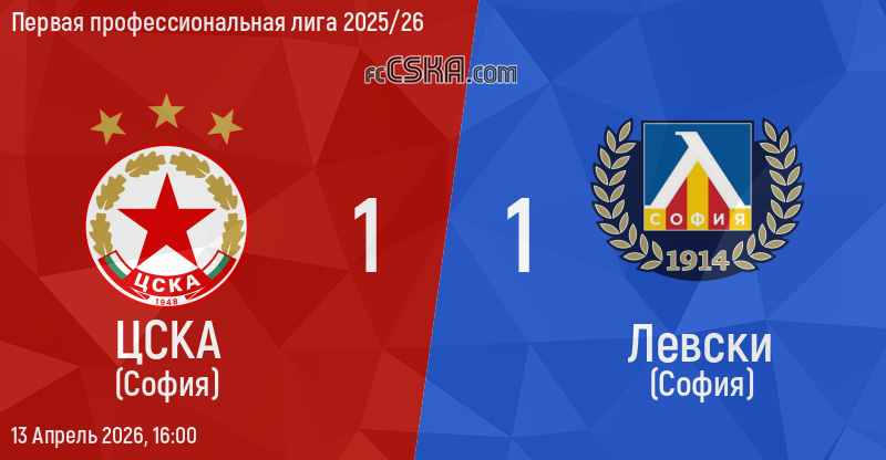 ЦСКА сыграла вничью с фк Левски (София) со счётом 1:1 в матче Первая профессиональная лига 2025/26 сыгранный 13 Апрель 2026 г. в 16:00 ч. на стадионе „Васил Левски“ в София. за армейцев отличился Леандро Годой (94′).