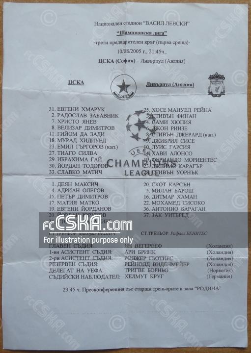 ЦСКА​ проиграла Ливерпуль со счётом 1:3 в матче Лига чемпионов 2005/06 сыгранный 10 Август 2005 г. в 21:45 ч. на стадионе „Васил Левски“ в София. за армейцев отличился Velizar Dimitrov (45′).