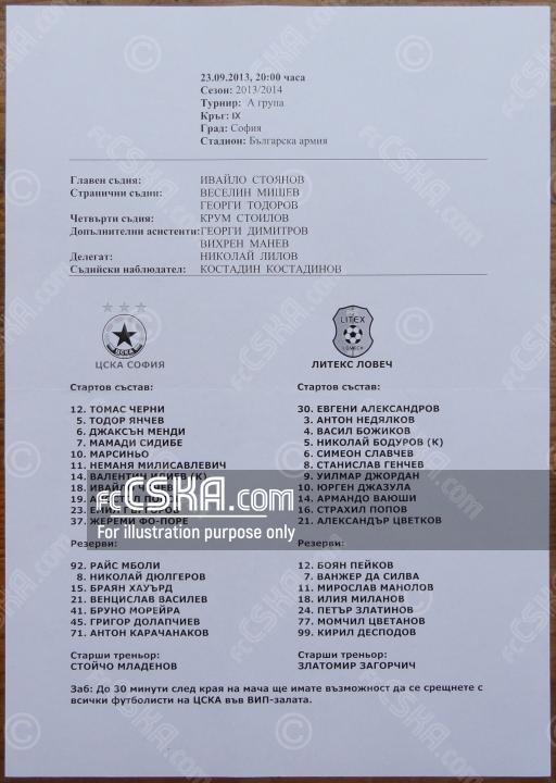 ЦСКА выиграл у Литекс (Ловеч) со счётом 1:0 в матче «А» футбольная группа 2013/14 сыгранный 23 Сентябрь 2013 г. в 20:00 ч. на стадионе „Болгарска армия“ в София. за армейцев отличился Ivaylo Chochev (11′).