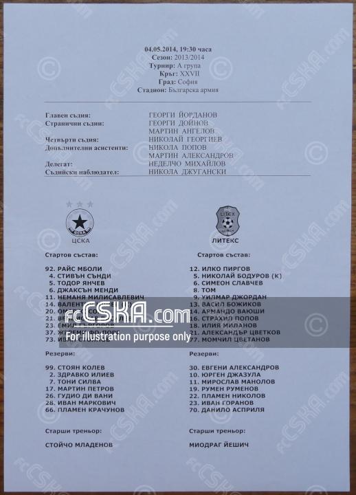 ЦСКА выиграл у Литекс (Ловеч) со счётом 2:0 в матче «А» футбольная группа 2013/14 - первая 7 сыгранный 4 Май 2014 г. в 19:30 ч. на стадионе „Болгарска армия“ в София. за армейцев отличились Ventsislav Vasilev (14′) и Omar Kosoko (61′).