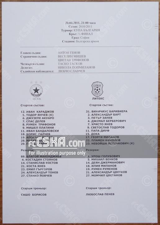ЦСКА​ выиграл у Литекс (Ловеч) со счётом 2:1 в матче Кубок Болгарии 2010/11 сыгранный 20 Апрель 2011 г. в 21:00 ч. на стадионе „Болгарска армия“ в София. за армейцев отличился Spas Delev (28′ и 87′).