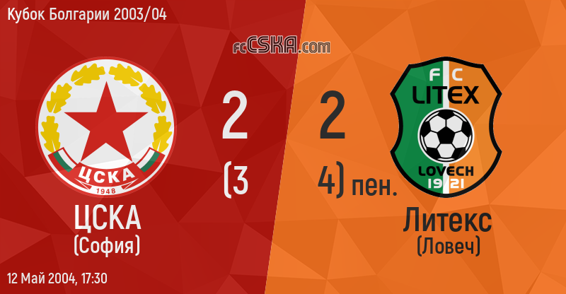 ЦСКА сыграла вничью с фк Литекс (Ловеч) со счётом 2:2 в матче Кубок Болгарии 2003/04 сыгранный 12 Май 2004 г. в 17:30 ч. на стадионе „Васил Левски“ в София. за армейцев отличились Zhuau Karlush (57′), Emil Gargorov (71′), Светослав Петров (128′ from penalty), Velizar Dimitrov (128′ from penalty) и Маркос Чарас (128′ from penalty).