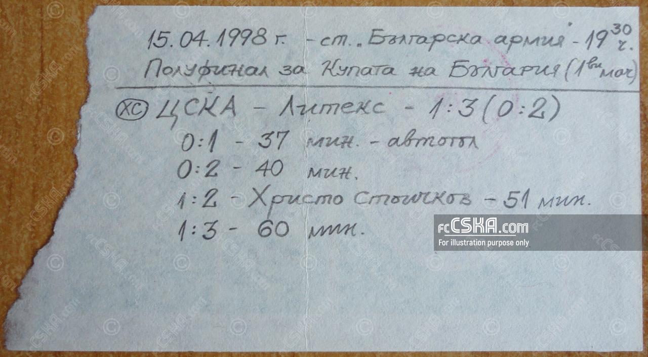 ЦСКА выиграл у Литекс (Ловеч) со счётом 3:0 в матче Кубок Болгарии 1997/98 сыгранный 15 Апрель 1998 г. на стадионе „Болгарска армия“ в София. за армейцев отличился Христо Стоичков (51′).