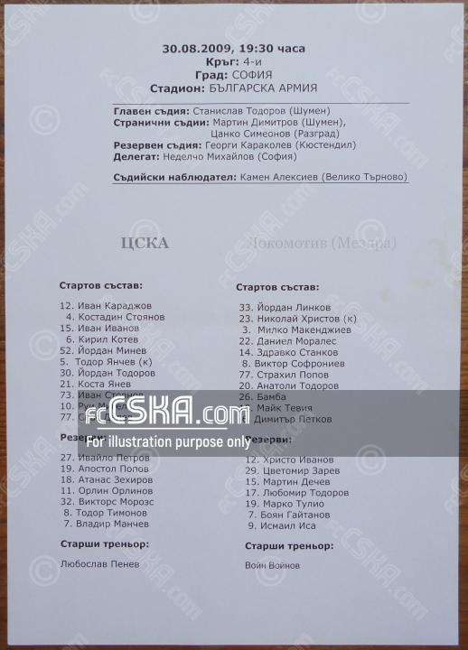 ЦСКА выиграл у Локомотив (Мездра) со счётом 4:0 в матче „А“ футбольная группа 2009/10 сыгранный 30 Август 2009 г. в 19:30 ч. на стадионе „Болгарска армия“ в София. за армейцев отличились Yordan Todorov (17′), Ivan Stoyanov (26′ и 77′ from penalty) и Владимир Манчев (69′).