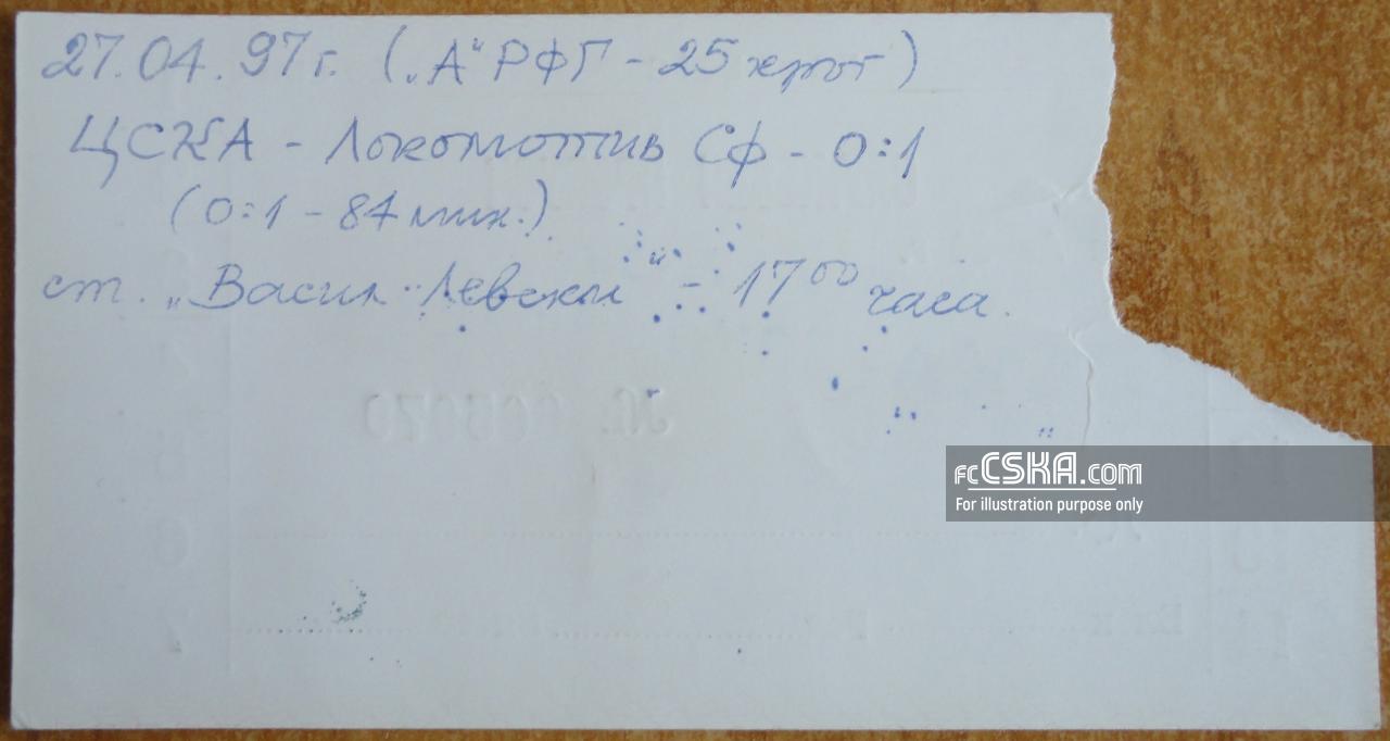 ЦСКА проиграла Локомотив (София) со счётом 0:1 в матче «А» профессиональная футбольная группа 1996/97 сыгранный 27 Апрель 1997 г. на стадионе „Васил Левски“ в София.