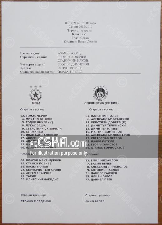 ЦСКА сыграла вничью с фк Локомотив (София) со счётом 1:1 в матче «А» футбольная группа 2012/13 сыгранный 9 Декабрь 2012 г. в 13:30 ч. на стадионе „Васил Левски“ в София. за армейцев отличился Serzhinyo (59′).
