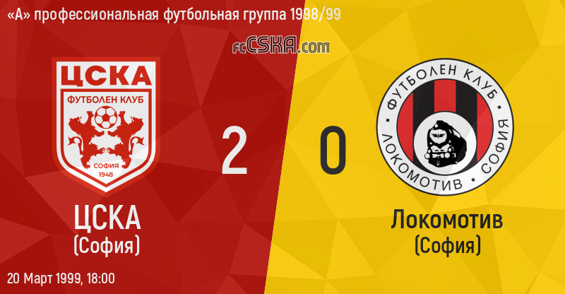ЦСКА​ выиграл у Локомотив (София) со счётом 2:0 в матче «А» профессиональная футбольная группа 1998/99 сыгранный 20 Март 1999 г. в 18:00 ч. на стадионе „Васил Левски“ в София. за армейцев отличился Красимир Чомаков (30′ и 35′).