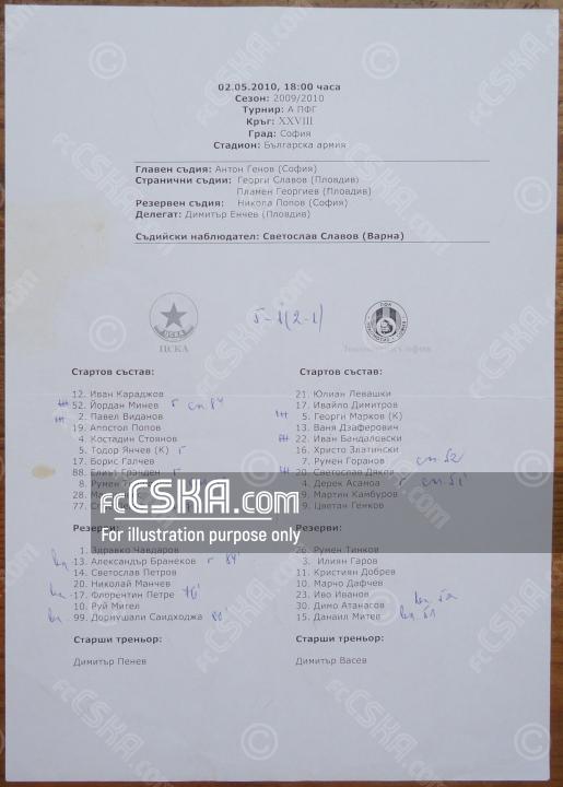 ЦСКА выиграл у Локомотив (София) со счётом 5:1 в матче „А“ футбольная группа 2009/10 сыгранный 2 Май 2010 г. в 18:00 ч. на стадионе „Болгарска армия“ в София. за армейцев отличились Markinyosh (33′), Йордан Минев (44′), Эллиот Грандин (50′), Тодор Янчев (72′) и Александар Бранеков (85′).