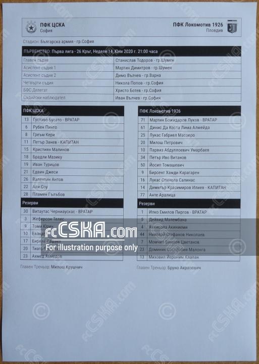 ЦСКА сыграла вничью с фк Локомотив 1926 (Пловдив) со счётом 1:1 в матче Первая профессиональная лига 2019/20 сыгранный 14 Июнь 2020 г. в 21:00 ч. на стадионе „Болгарска армия“ в София. за армейцев отличился Тиаго Родригес (83′).