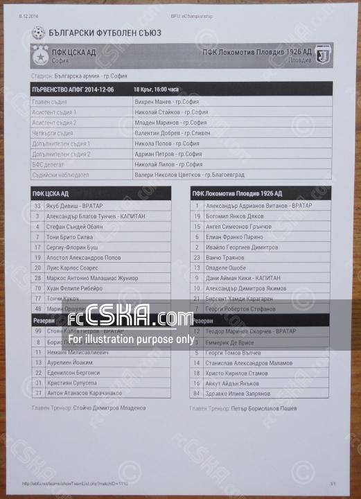 ЦСКА выиграл у Локомотив 1926 (Пловдив) со счётом 2:0 в матче «А» футбольная группа 2014/15 сыгранный 6 Декабрь 2014 г. в 16:00 ч. на стадионе „Болгарска армия“ в София. за армейцев отличились Marin Orshulich (58′) и Orelien Yoahim (85′).