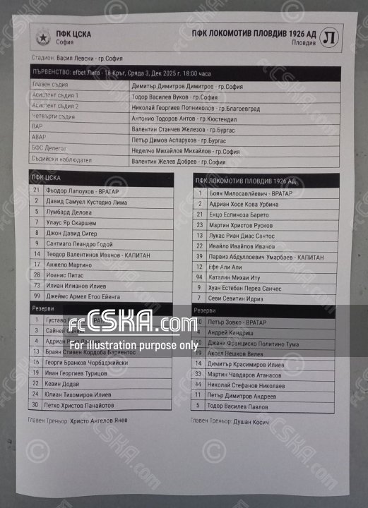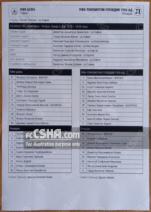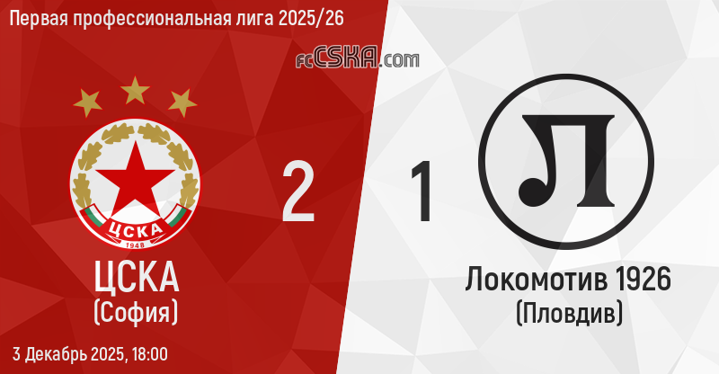 ЦСКА выиграл у Локомотив 1926 (Пловдив) со счётом 2:1 в матче Первая профессиональная лига 2025/26 сыгранный 3 Декабрь 2025 г. в 18:00 ч. на стадионе „Васил Левски“ в София. за армейцев отличился Леандро Годой (35′ и 95′ from penalty).