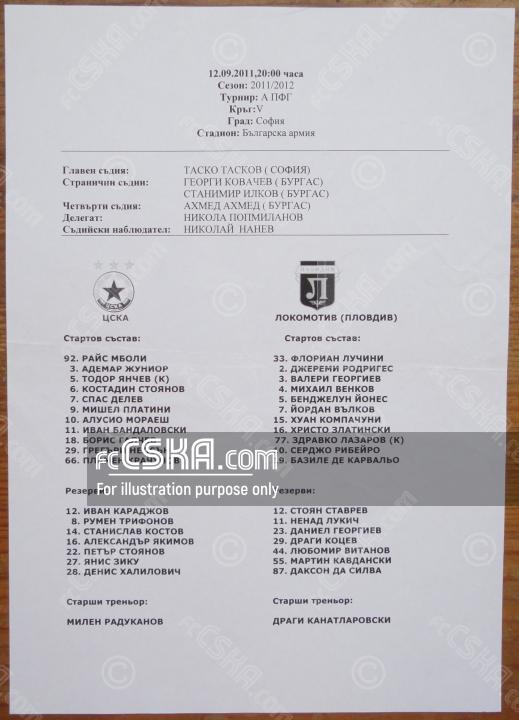 ЦСКА​ выиграл у Локомотив 1926 (Пловдив) со счётом 3:0 в матче «А» футбольная группа 2011/12 сыгранный 12 Сентябрь 2011 г. в 20:00 ч. на стадионе „Болгарска армия“ в София. за армейцев отличились Mishel Platini (19′), Zhunior Moraesh (36′ from penalty) и Spas Delev (66′).
