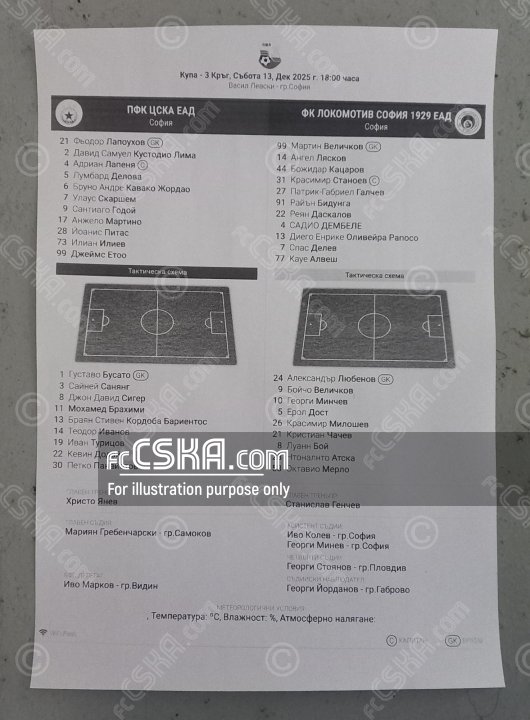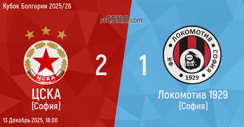ЦСКА выиграл у Локомотив 1929 (София) со счётом 2:1 в матче Кубок Болгарии 2025/26 сыгранный 13 Декабрь 2025 г. в 18:00 ч. на стадионе „Васил Левски“ в София. за армейцев отличился Бруно Жордао (69′). Автогол - guests scored Садио Дембеле[1] (29′).