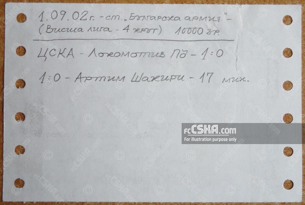 ЦСКА выиграл у Локомотив 1936 (Пловдив) со счётом 1:0 в матче Высшая профессиональная лига 2002/03 сыгранный 1 Сентябрь 2002 г. в 20:00 ч. на стадионе „Болгарска армия“ в София. за армейцев отличился Артим Шакири (17′).