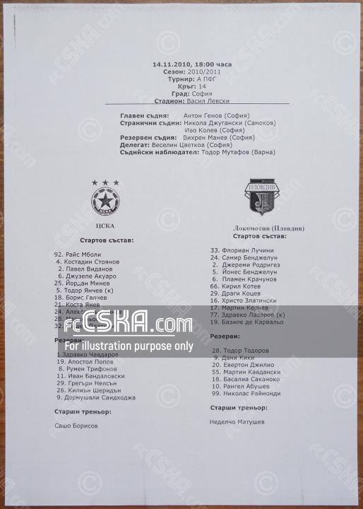ЦСКА выиграл у Локомотив 1936 (Пловдив) со счётом 1:0 в матче „А“ футбольная группа 2010/11 сыгранный 14 Ноябрь 2010 г. в 18:00 ч. на стадионе „Васил Левски“ в София. за армейцев отличился Markinyosh (53′).