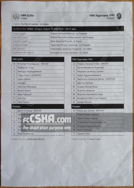 ЦСКА сыграла вничью с фк Лудогорец 1945 (Разград) со счётом 0:0 в матче Первая профессиональная лига 2018/19 - первая шестёрка сыгранный 11 Май 2019 г. в 20:15 ч. на стадионе „Болгарска армия“ в София.