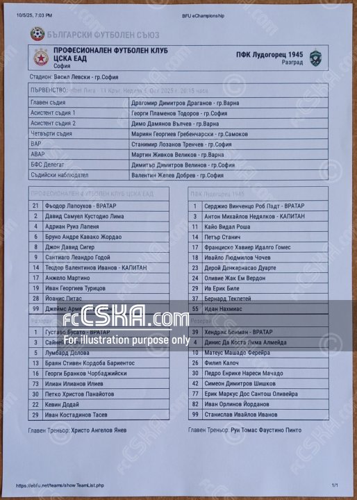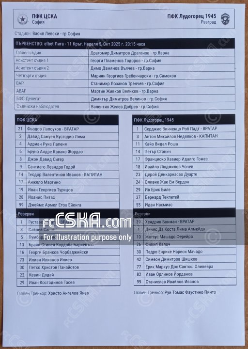ЦСКА сыграла вничью с фк Лудогорец 1945 (Разград) со счётом 0:0 в матче Первая профессиональная лига 2025/26 сыгранный 5 Октябрь 2025 г. в 20:15 ч. на стадионе „Васил Левски“ в София.