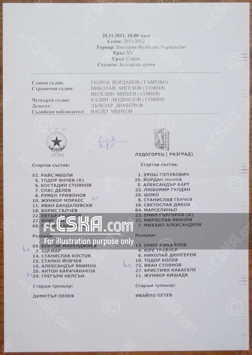 ЦСКА сыграла вничью с фк Лудогорец 1945 (Разград) со счётом 2:2 в матче «А» футбольная группа 2011/12 сыгранный 28 Ноябрь 2011 г. в 18:00 ч. на стадионе „Болгарска армия“ в София. за армейцев отличился Zhunior Moraesh (2′ и 20′).