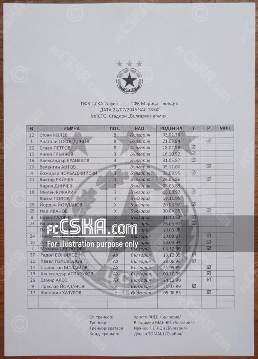 ЦСКА выиграл у Марица 1921 (Пловдив) со счётом 3:1 в матче Товарищеские матчи 2015/16 сыгранный 22 Июль 2015 г. в 19:00 ч. на стадионе „Болгарска армия“ в София. за армейцев отличились Vladislav Uzunov (18′), Костадин Хазуров (49′) и Nikolay Tsvetkov (91′).