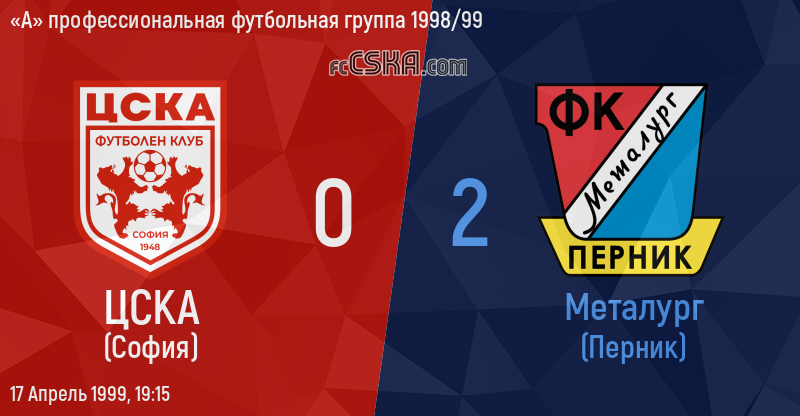 ЦСКА проиграла Металург (Перник) со счётом 0:2 в матче «А» профессиональная футбольная группа 1998/99 сыгранный 17 Апрель 1999 г. в 19:15 ч. на стадионе „Болгарска армия“ в София.