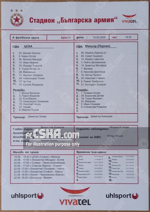ЦСКА выиграл у Миньор (Перник) со счётом 2:0 в матче «А» футбольная группа 2008/09 сыгранный 19 Сентябрь 2008 г. в 19:30 ч. на стадионе „Болгарска армия“ в София. за армейцев отличились Yordan Todorov (20′) и Ivan K. Ivanov (59′).