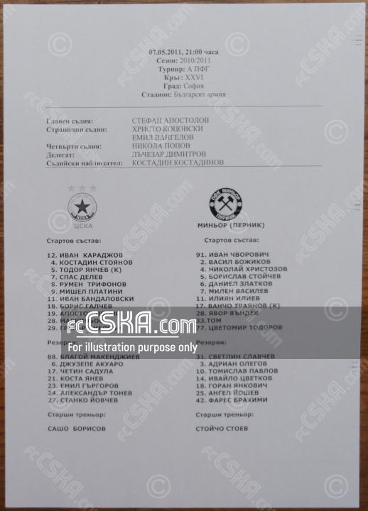 ЦСКА​ выиграл у Миньор (Перник) со счётом 2:0 в матче „А“ футбольная группа 2010/11 сыгранный 7 Май 2011 г. в 21:00 ч. на стадионе „Болгарска армия“ в София. за армейцев отличился Mishel Platini (45′ и 56′).