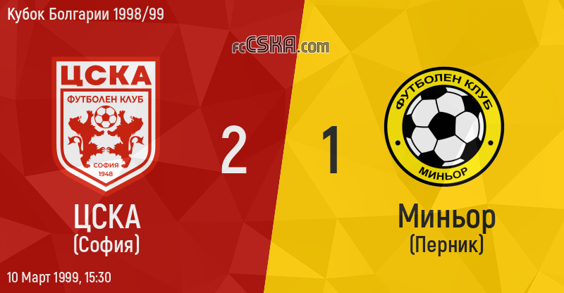 ЦСКА выиграл у Миньор (Перник) со счётом 2:1 в матче Кубок Болгарии 1998/99 сыгранный 10 Март 1999 г. в 15:30 ч. на стадионе „Болгарска армия“ в София. за армейцев отличились Адальберт Зафиров (5′ from penalty) и Димитр Бербатов (74′).