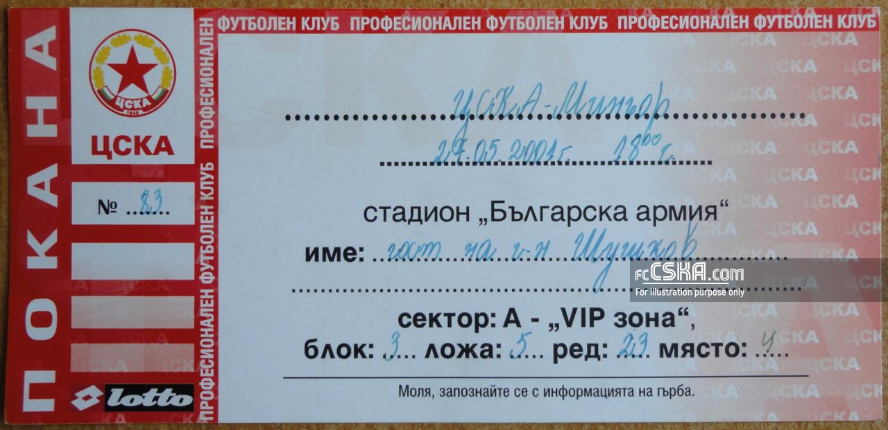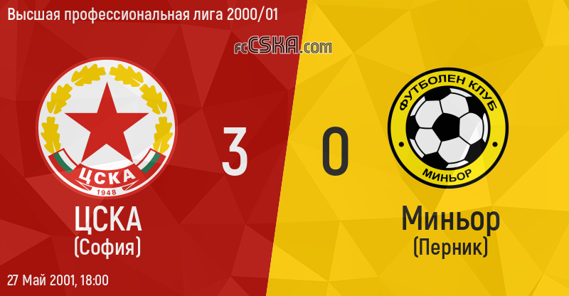 ЦСКА выиграл у Миньор (Перник) со счётом 3:0 в матче Высшая профессиональная лига 2000/01 сыгранный 27 Май 2001 г. в 18:00 ч. на стадионе „Болгарска армия“ в София. за армейцев отличились Христо Янев (2′), Светослав Петров (63′) и Владимир Манчев (80′).