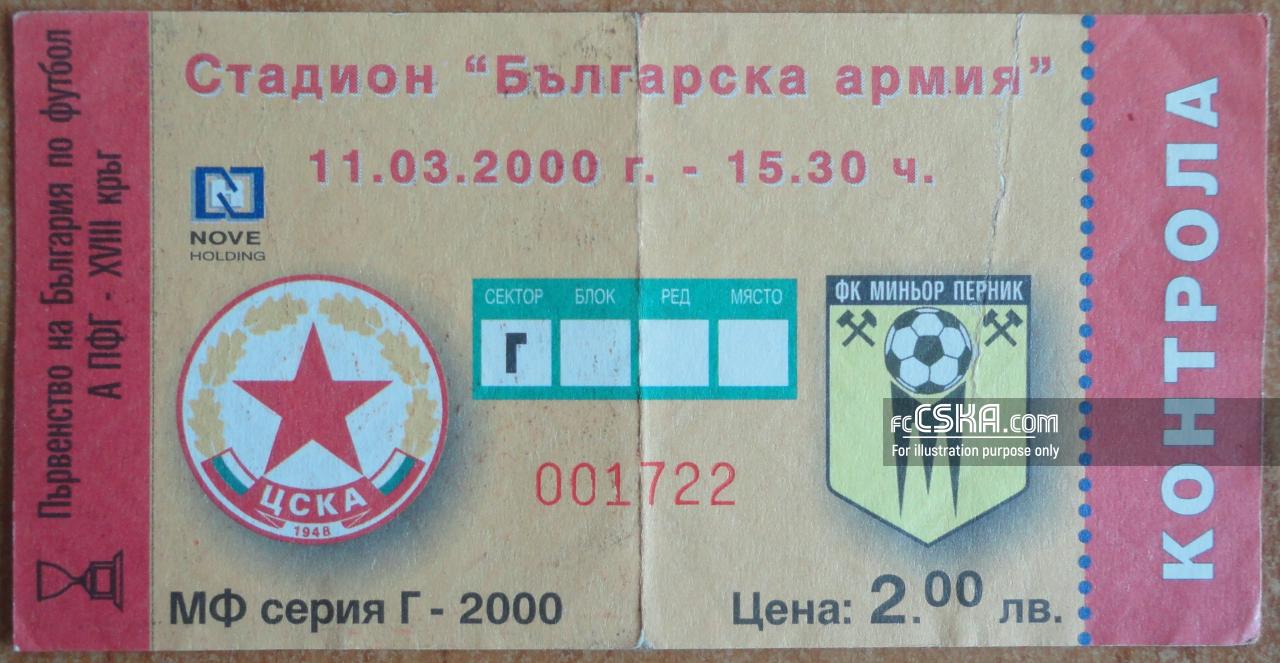 ЦСКА выиграл у Миньор (Перник) со счётом 6:1 в матче «А» профессиональная футбольная группа 1999/00 сыгранный 11 Март 2000 г. в 15:30 ч. на стадионе „Болгарска армия“ в София. за армейцев отличились Светослав Петров (2′), Димитр Иванов (17′ и 52′), Красимир Чомаков (20′ и 43′) и Димитр Бербатов (55′).