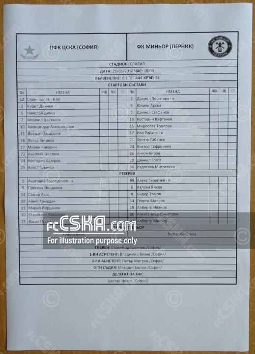 ЦСКА выиграл у Миньор (Перник) со счётом 6:1 в матче Юго-Западная «В» группа 2015/16 сыгранный 29 Май 2016 г. в 18:00 ч. на стадионе „Славия“ в София. за армейцев отличились Nikolay Dichev (13′), Yordan Yordanov (32′), Nikolay Tsvetkov (34′ и 52′), Костадин Хазуров (61′) и Mario Yordanov (71′).