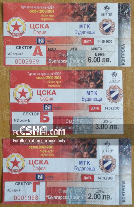 ЦСКА проиграла МТК (Будапешт) со счётом 1:2 в матче Кубок УЕФА 2000/01 сыгранный 14 Сентябрь 2000 г. на стадионе „Болгарска армия“ в София. за армейцев отличился Христо Янев (6′).