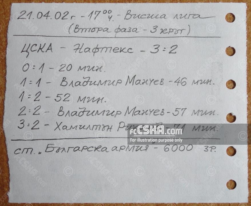ЦСКА выиграл у Нафтекс (Бургас) со счётом 3:2 в матче Высшая лига 2001/02 - первая группа сыгранный 21 Апрель 2002 г. в 17:00 ч. на стадионе „Болгарска армия“ в София. за армейцев отличились Владимир Манчев (46′ и 57′) и Hamilton Rikard (71′).