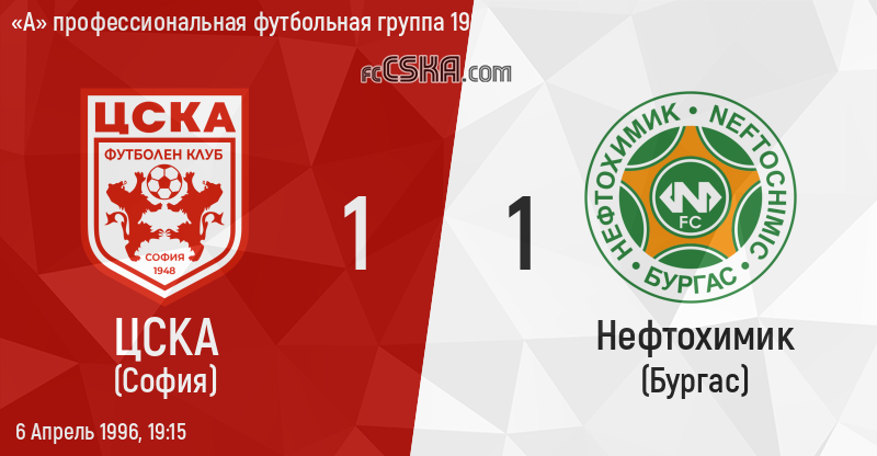 ЦСКА​ сыграла вничью с фк Нефтохимик (Бургас) со счётом 1:1 в матче «А» профессиональная футбольная группа 1995/96 сыгранный 6 Апрель 1996 г. в 19:15 ч. на стадионе „Болгарска армия“ в София. за армейцев отличился Галин Иванов (78′).