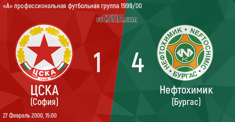 ЦСКА проиграла Нефтохимик (Бургас) со счётом 1:4 в матче «А» профессиональная футбольная группа 1999/00 сыгранный 27 Февраль 2000 г. в 15:00 ч. на стадионе „Болгарска армия“ в София. за армейцев отличился Димитр Иванов (45′).