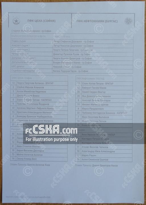 ЦСКА выиграл у Нефтохимик 1962 (Бургас) со счётом 5:1 в матче Первая профессиональная лига 2016/17 сыгранный 14 Август 2016 г. в 21:15 ч. на стадионе „Болгарска армия“ в София. за армейцев отличились Preslav Yordanov (2′), Арсенио (5′), Diogo Viana (20′ и 21′) и Bozhidar Chorbadzhiyski (81′).