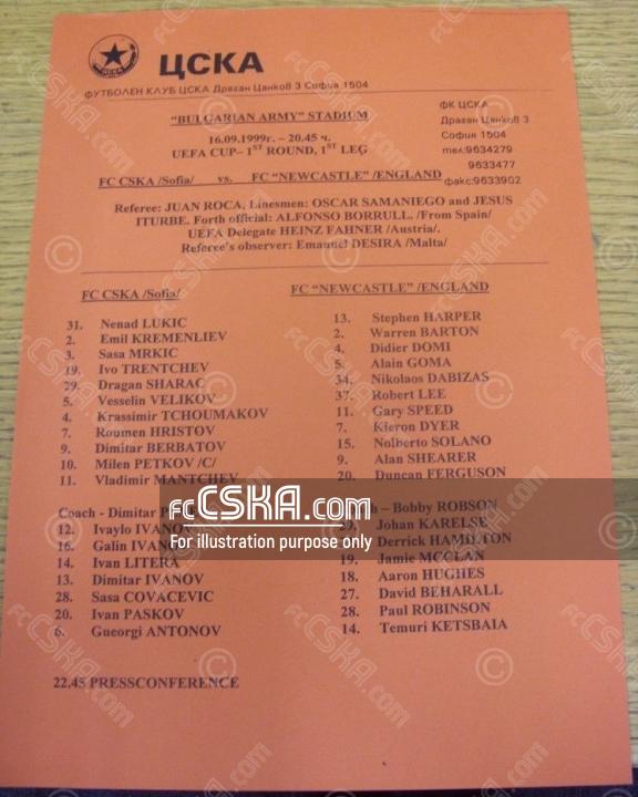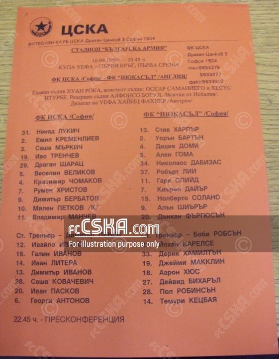 ЦСКА проиграла Ньюкасл Юнайтед со счётом 0:2 в матче Кубок УЕФА 1999/00 сыгранный 16 Сентябрь 1999 г. на стадионе „Болгарска армия“ в София.