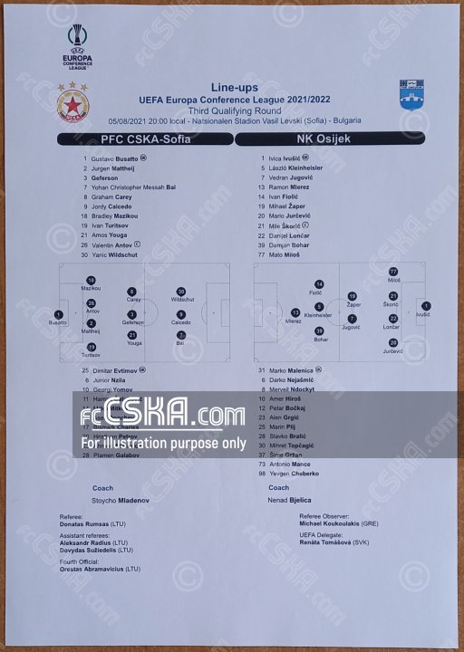 ЦСКА выиграл у Осиек со счётом 4:2 в матче Лига конференций 2021/22 сыгранный 5 Август 2021 г. в 20:00 ч. на стадионе „Васил Левски“ в София. за армейцев отличились Брэдли Мазику (30′), Грэм Кэри (39′), Хорди Кайседо (42′) и Георги Йомов (74′).