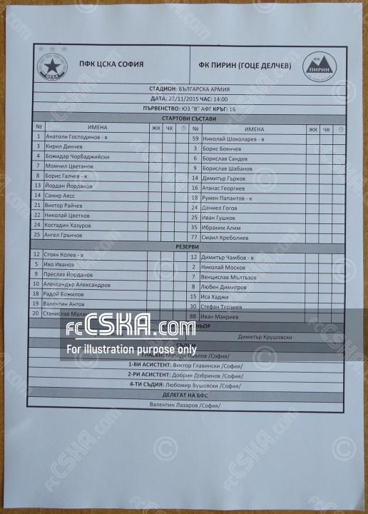 ЦСКА выиграл у Пирин (Гоце Делчев) со счётом 4:0 в матче Юго-Западная «В» группа 2015/16 сыгранный 22 Ноябрь 2015 г. в 14:00 ч. на стадионе „Болгарска армия“ в София. за армейцев отличились Samir Ayass (6′), Momchil Tsvetanov (21′), Nikolay Tsvetkov (73′) и Boris Galchev (76′).