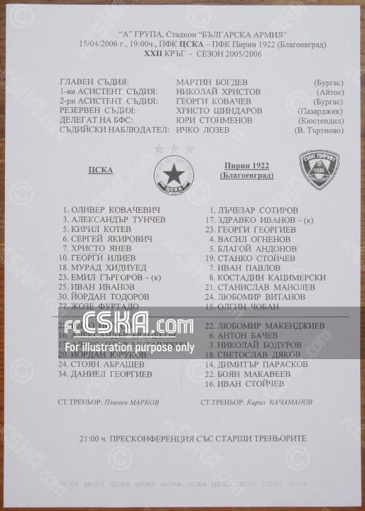 ЦСКА выиграл у Пирин 1922 (Благоевград) со счётом 2:0 в матче «А» футбольная группа 2005/06 сыгранный 15 Апрель 2006 г. в 19:00 ч. на стадионе „Болгарска армия“ в София. за армейцев отличились Zhuze Furtadu (1′) и Сергей Якирович (32′).