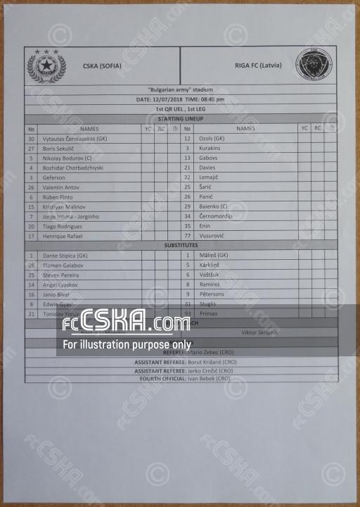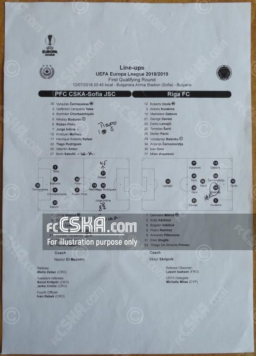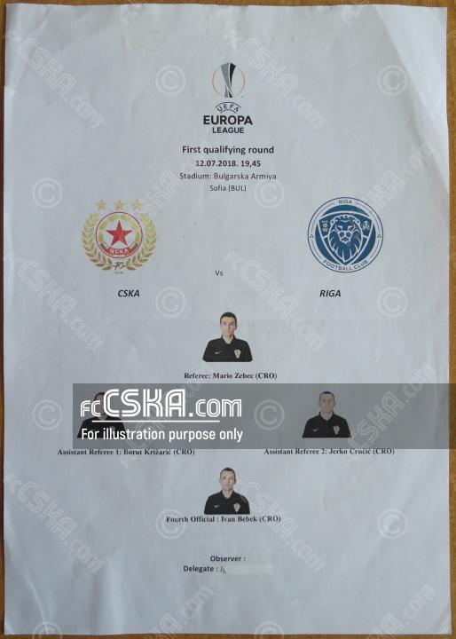 ЦСКА выиграл у Рига со счётом 1:0 в матче Лига Европы 2018/19 сыгранный 12 Июль 2018 г. в 20:45 ч. на стадионе „Болгарска армия“ в София. за армейцев отличился Тиаго Родригес (49′).