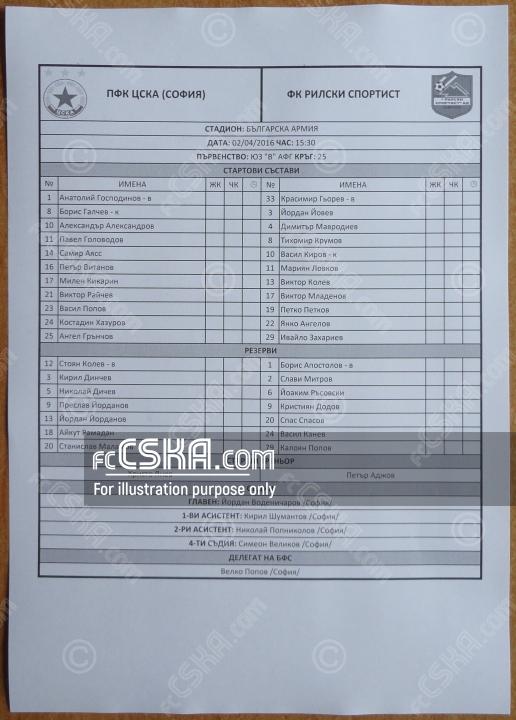 ЦСКА выиграл у Рилски спортист 2011 (Самоков) со счётом 5:2 в матче Юго-Западная «В» группа 2015/16 сыгранный 2 Апрель 2016 г. в 15:30 ч. на стадионе „Болгарска армия“ в София. за армейцев отличились Samir Ayass (8′), Ангел Грынчов (10′), Павел Головодов (22′), Boris Galchev (56′) и Александар И. Александров (79′).