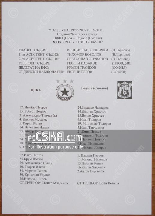 ЦСКА​ выиграл у Родопа (Смолян) со счётом 1:0 в матче «А» футбольная группа 2006/07 сыгранный 20 Май 2007 г. в 16:30 ч. на стадионе „Болгарска армия“ в София. за армейцев отличился Александар Тунчев (10′).