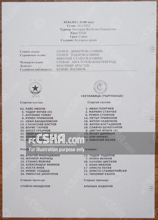 ЦСКА выиграл у Светкавица 1922 (Тырговиште) со счётом 3:0 в матче «А» футбольная группа 2011/12 сыгранный 9 Апрель 2012 г. в 20:00 ч. на стадионе „Болгарска армия“ в София. за армейцев отличились Антон Карачанаков (9′), Boris Galchev (39′) и Джеорджиан Пэун (41′).