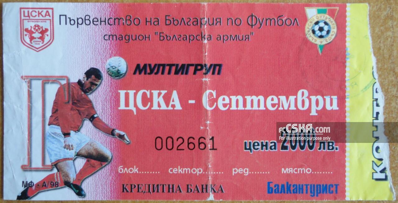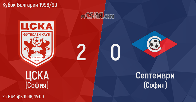 ЦСКА выиграл у Септември (София) со счётом 2:0 в матче Кубок Болгарии 1998/99 сыгранный 25 Ноябрь 1998 г. в 14:00 ч. на стадионе „Болгарска армия“ в София. за армейцев отличился Валентин Станчев (10′ и 62′).