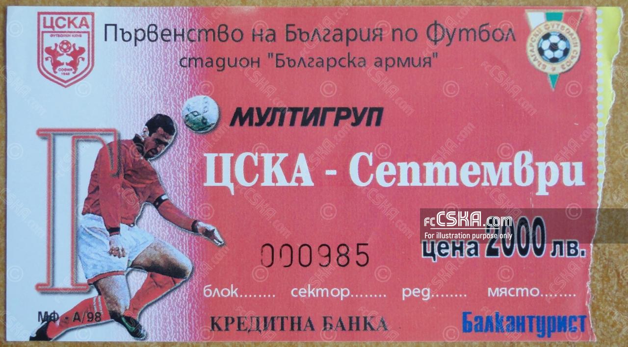 ЦСКА выиграл у Септември (София) со счётом 3:1 в матче «А» профессиональная футбольная группа 1998/99 сыгранный 17 Октябрь 1998 г. в 17:15 ч. на стадионе „Болгарска армия“ в София. за армейцев отличились Martin Petrov (4′), Georgi Yordanov (23′) и Румен Христов (83′).
