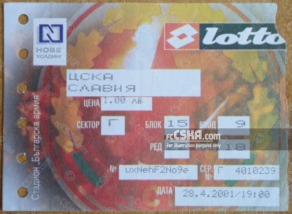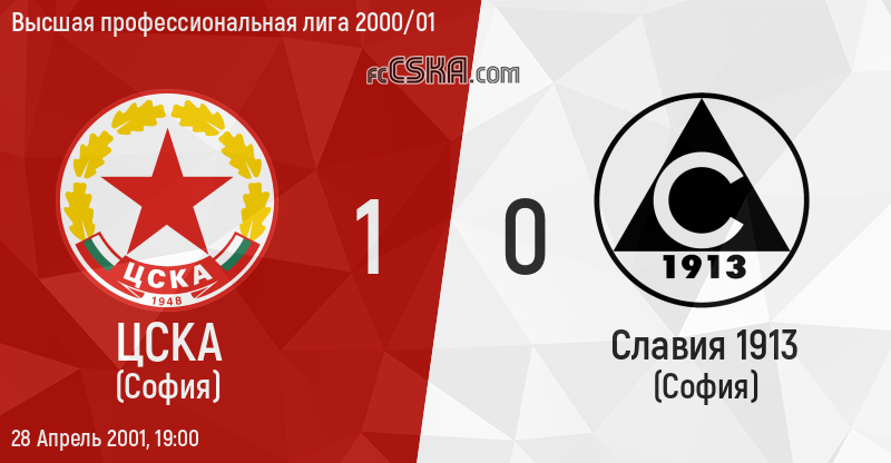 ЦСКА выиграл у Славия 1913 (София) со счётом 1:0 в матче Высшая профессиональная лига 2000/01 сыгранный 28 Апрель 2001 г. в 19:00 ч. на стадионе „Болгарска армия“ в София. за армейцев отличился Асен Букарев (37′).